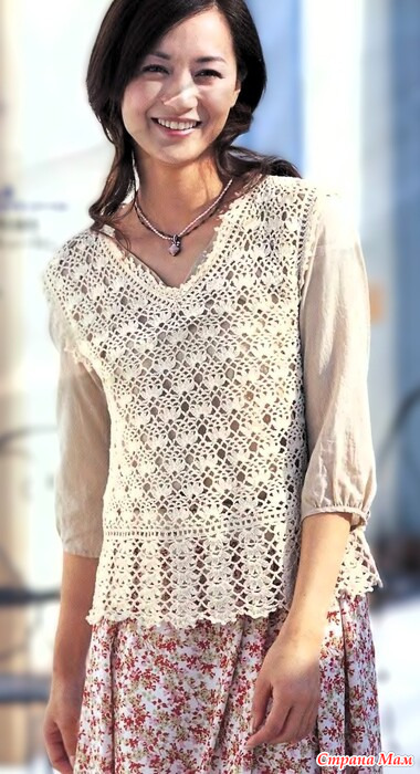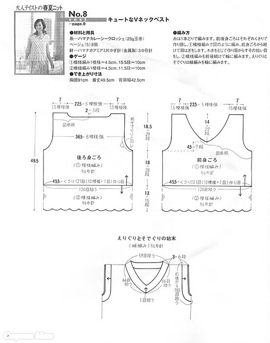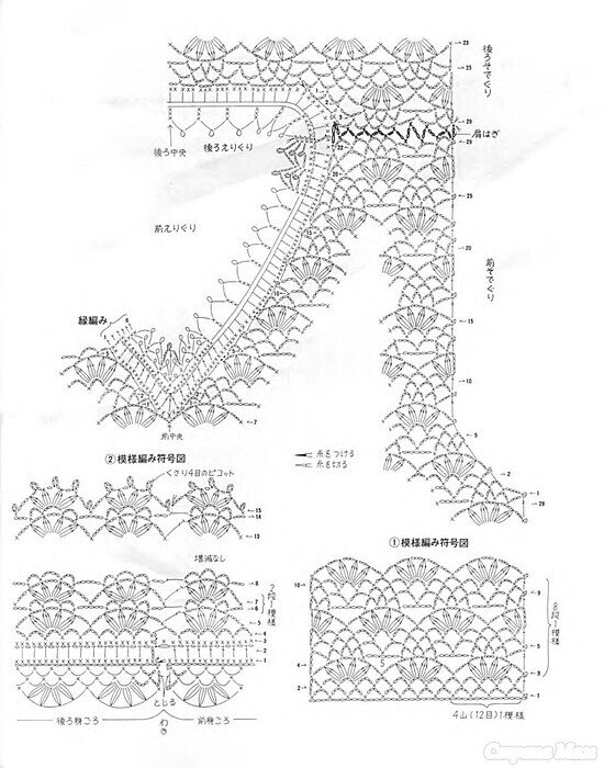 Пряжа используется для однониточного вязания. Для передней и задней частей тела наберите петли воздушной петлей, затем провяжите узором ①, как показано на схеме, и продолжайте от передней части тела до соединения плеч. Зашейте боковые части, поднимите петли с набранных петель до низа и провяжите узором ② по кругу, продолжая для передней и задней частей. Вывяжите горловину и проймы по кругу, используя обвязку.
