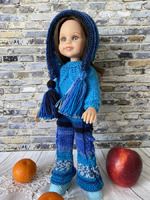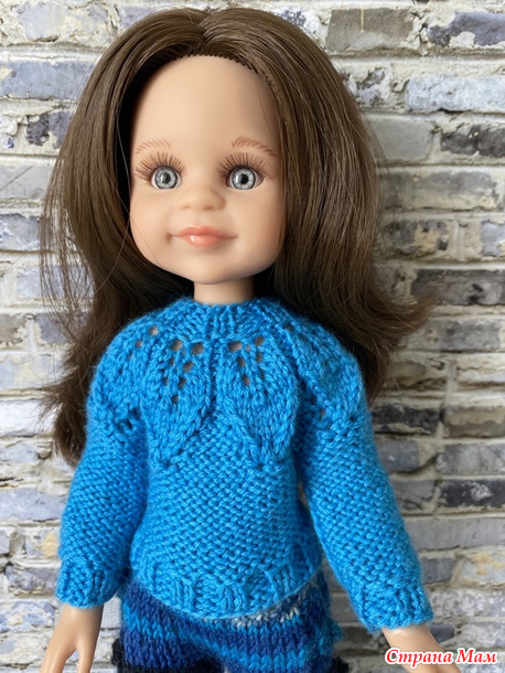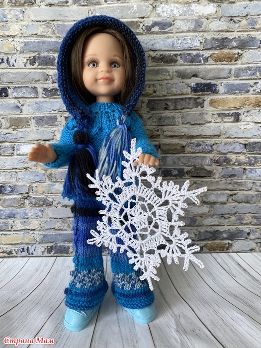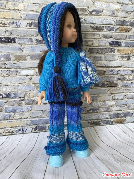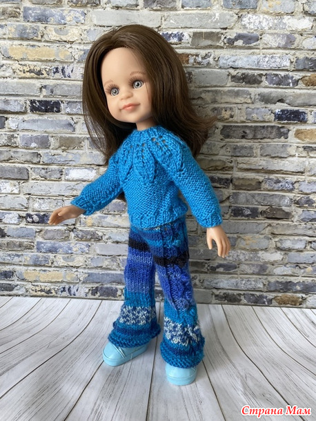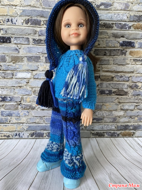 Комплект из зимней коллекции. Состоит из свитера с круглой кокеткой, украшенной узором с листочками, расклешенных брюк, связанных из секционной пряжи и шапочки Капуцын с кисточками. Демонстрирует комплект шарнирная куколка Салю. Читать полностью
