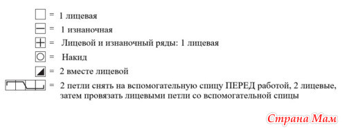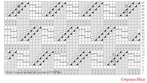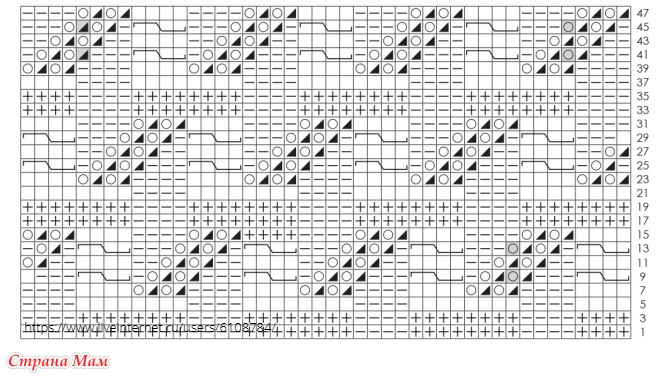 Далее продолжить на спицах № 4, вязать между кромочными ажурным узором по схеме, соблюдая обозначения начала узора.