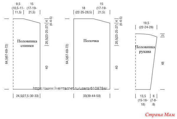Ажурный узор: Смотрите схему вязания. На схеме показаны только лицевые ряды. В изнаночных рядах петли вязать по обозначениям в инструкции к схеме. Начинать с петель перед раппортом, отмеченных для соответствующей детали и размера, затем постоянно повторять раппорт, и заканчивать петлями после раппорта, отмеченными для соответствующей детали и размера. Постоянно повторять 1–48-й ряды.