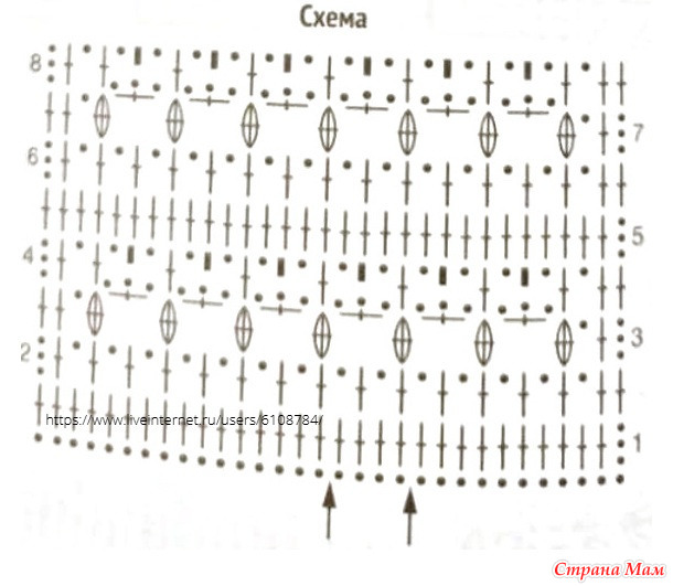 Рельефный узор с дырочками: вязать по схеме ряда ми в прямом и обратном направлении. Цифрами с правого внешнего края обозначены лиц. ряды, с левого внешнего края - изн. ряды. 1-й ст. с/н 1-го ряда связать 5-ю в. п. от крючка. Начиная со 2-го ряда выполнять вместо 1-го ст. с/н 3 в. п. подъема. В ширину начать с петель перед 1-й стрелкой, раппорт между стрелками постоянно повторять, закончить петлями после 2-й стрелки. На схеме приведено несколько раппортов.
