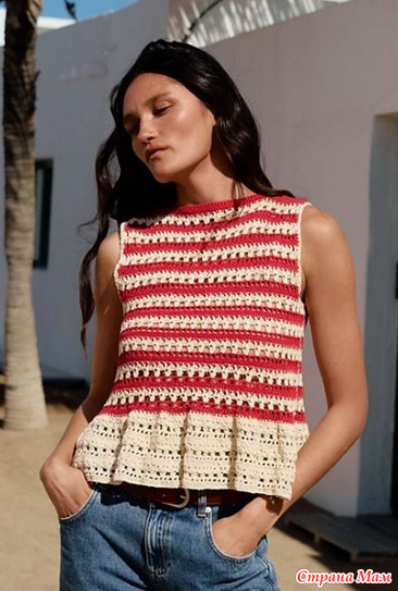 Спинка: кремовой нитью выполнить цепочку из 211 (227-243) в. п. + 3 в. п. подъема вместо 1-го ст. с/н и вязать рельефным узором с дырочками = 211 (227-243) ст. с/н после 1-го ряда. На высоте волана 13 см = в 13-м р. (= ряд из ст. с/н) провязать для получения нужной ширины после первых 2 ст. с/н и перед последним ст. с/н по 2 ст. с/н вместе = 107 (115-123) п. Продолжить вязать рельефным узором с дырочками, начиная с 5-го р. (друг за другом находятся 2 лиц, ряда из ст. с/н) и выполняя чередование полос. Через 20 (22-24) см = 20 (22-24) р. от окончания волана убавить с обеих сторон для пройм 8 п. = 91 (99-107) п. и продолжить вязать рельефным узором с дырочками прямо. Через 18 (20-22) см = 18 (20-22) р. от начала пройм работу закончить. Средние 49 п. приходятся на вырез горловины, по 21 (25-29) п. с обеих сторон oтносятся к плечам.