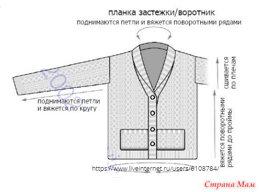 Карманы вяжутся отдельно и откладываются в сторону. Основная часть кардигана вяжется поворотными рядами от нижнего края до проймы одной деталью. Полочки и спинка разделяются у проймы и вяжутся поворотными рядами до плеча.