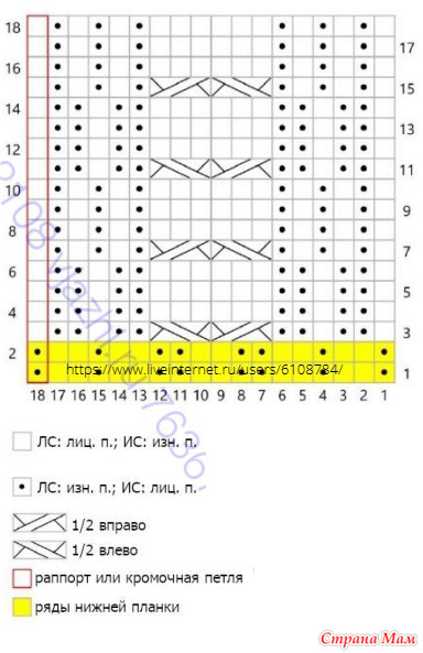 На схеме ряды 1-2 выделены желтым цветом и предназначены ТОЛЬКО для резинки. Когда нижняя планка будет закончена, повторять ряды 3–18 схемы, чтобы вывязать узор на теле.