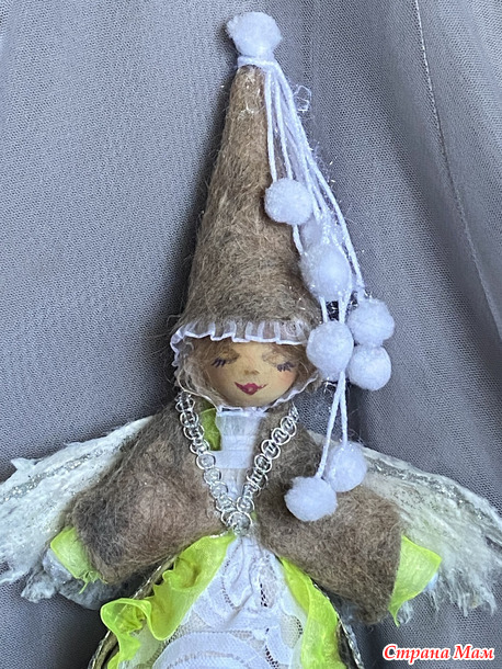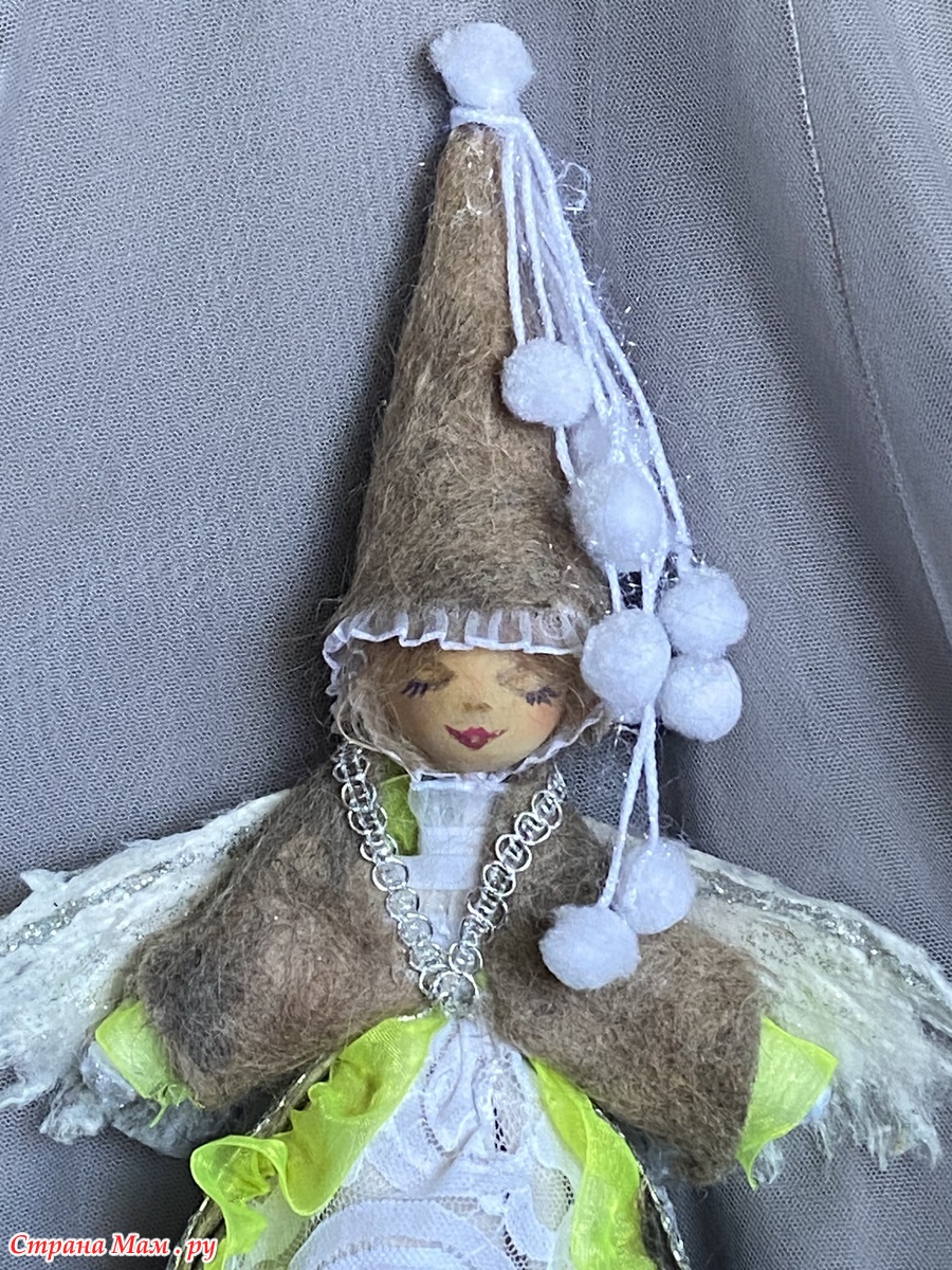 Обмотала его голову закрепила на клей. Голова за счет проволоки слегка подвижная, как и ручки и ножки. При желании можно и посадить ангелочка. Колпачок украсила гирляндой пушистых комочков.