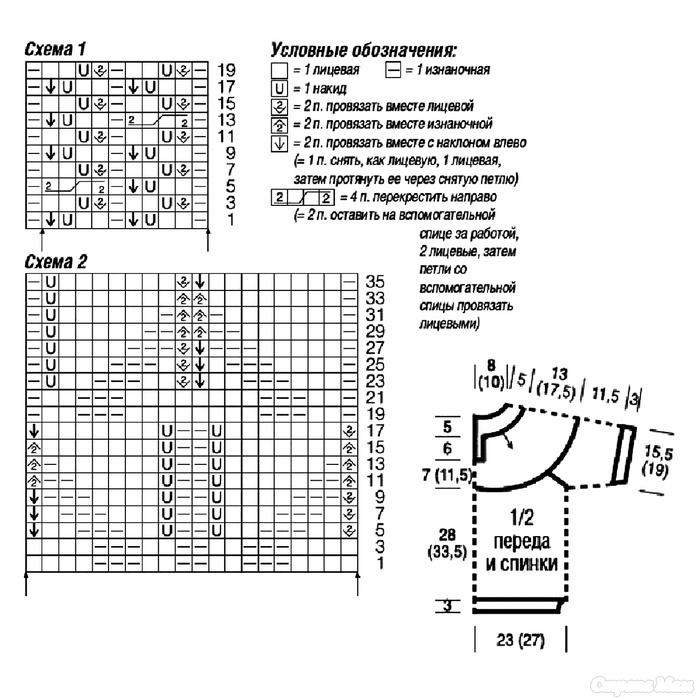 Вязать по схеме 1. На ней даны лицевые ряды; в изнаночных рядах петли провязывать по рисунку, накиды провязывать изнаночными.