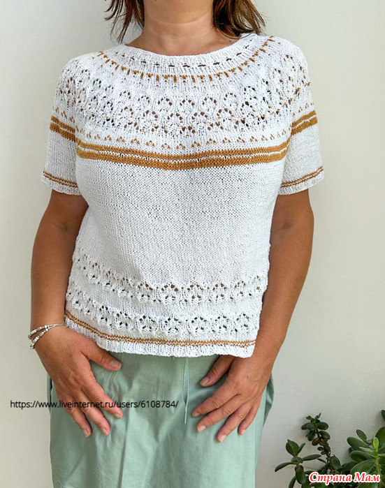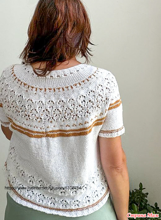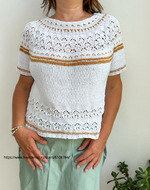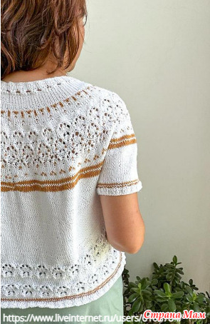 Пуловер вяжется из летней хлопковой пряжи, без швов, сверху вниз. Сначала формируется круглая кокетка, после петли рукавов отделяются от корпуса, сам корпус и затем рукава вяжутся круговыми рядами до низа. Дизайн модели предполагает обычную длину пуловера, но Вы легко сможете адаптировать длину корпуса прямо во время работы. К примеру, Вы можете связать укороченный вариант топа, чтобы носить его поверх летнего платья.