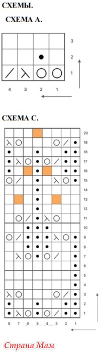Примечание. В Схеме С в Рядах 16 и 20 подхватывайте нить нерабочего цвета (нить Цвета 2) на ИС каждые 2-3 петли, чтобы избежать длинных протяжек, которые могут быть заметны в проушинах ажурного узора предыдущего ряда.