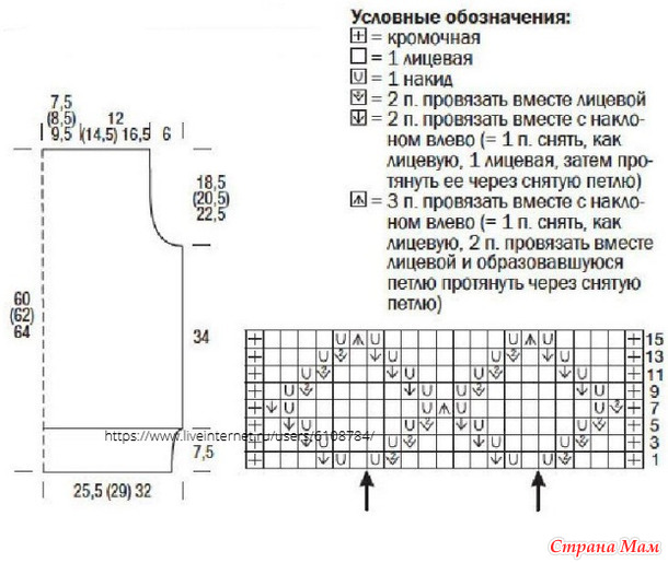 Плотность вязания: последовательность узоров 16 п. х 20 р. = 10 x 10 см, лицевая гладь 15 п. х 23 р. = 10 х 10 см.
