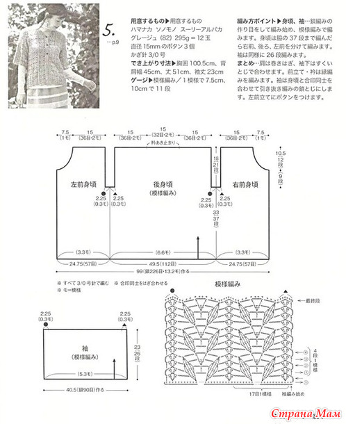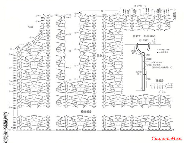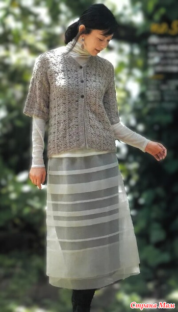 Краткое описание... Плечи соединяются подвернутым швом, а проймы — соединительным швом. Планка и воротник связаны с каймой. Рукава соединяются с основной частью изделия с помощью соединительных петель и воздушных петель, совпадающих по меткам. К левой планке пришивается пуговица.
