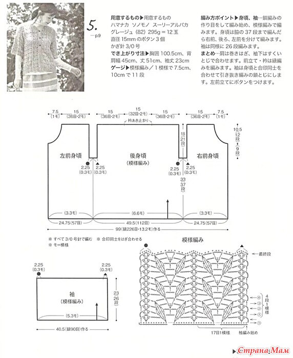 Размеры готового изделия: обхват груди 100,5 см, ширина плеч по спинке 45 см, длина 51 см, длина рукава 23 см. Плотность вязания: лицевая гладь / 7,5 см на узор, 11 рядов по 10 см каждый.