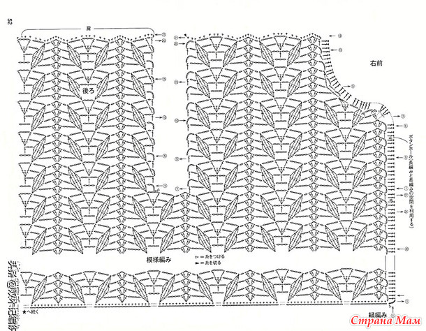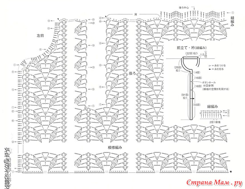Советы по вязанию основной части и рукавов: Начните с создания начальной цепочки и провяжите узором. После того, как провяжете 37 рядов основной части по боковым швам, провяжите отдельно правую переднюю часть, заднюю часть и левую переднюю часть.