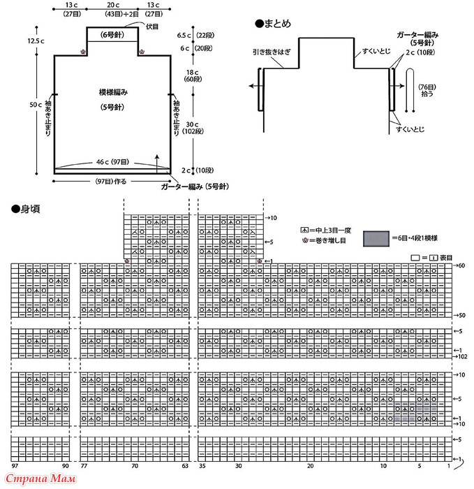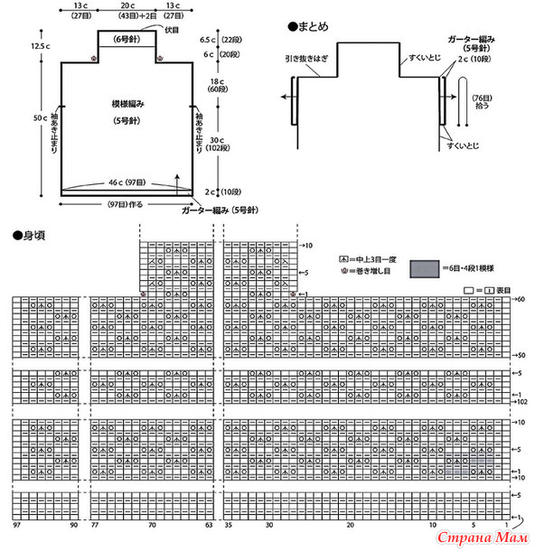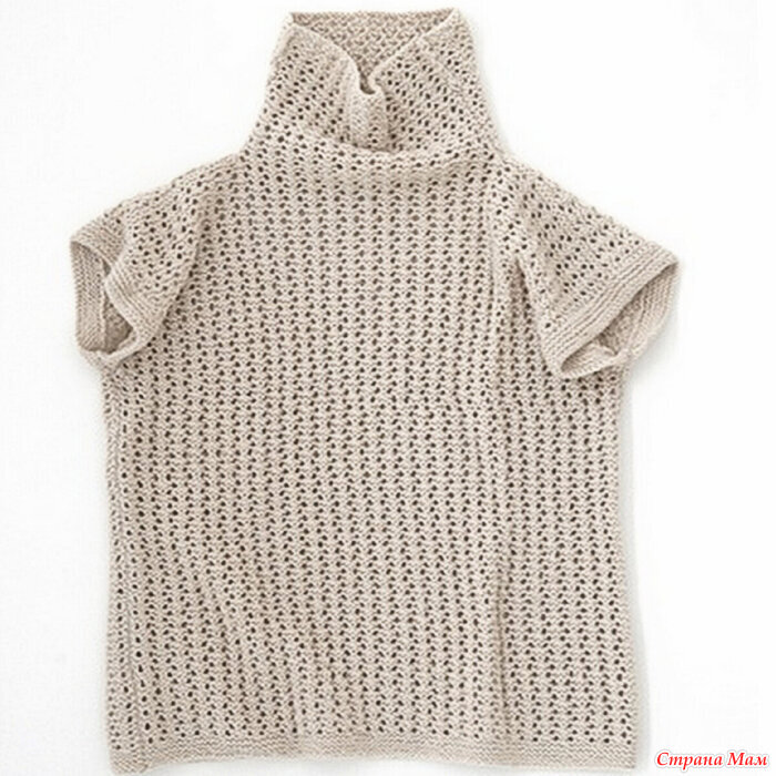 Прямой фасон (за счёт свободного кроя получается слегка спущенный рукавчик), цельный ворот-гольф — вяжется одновременно с передом и спинкой (для спинки лучше связать росток, чтобы ворот не тянул).