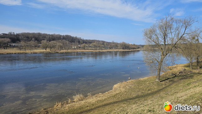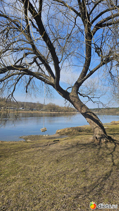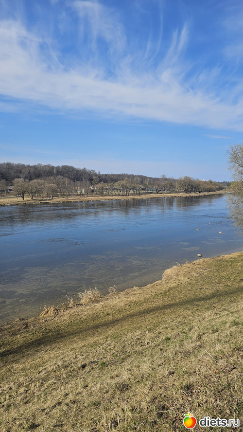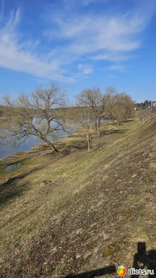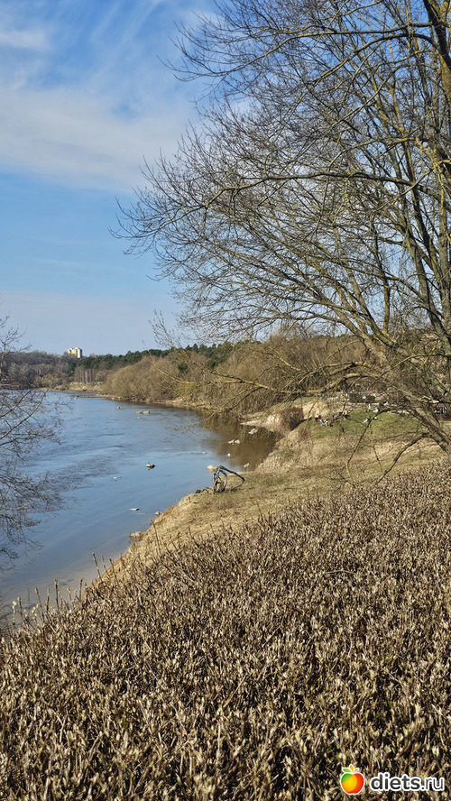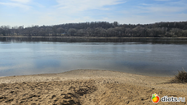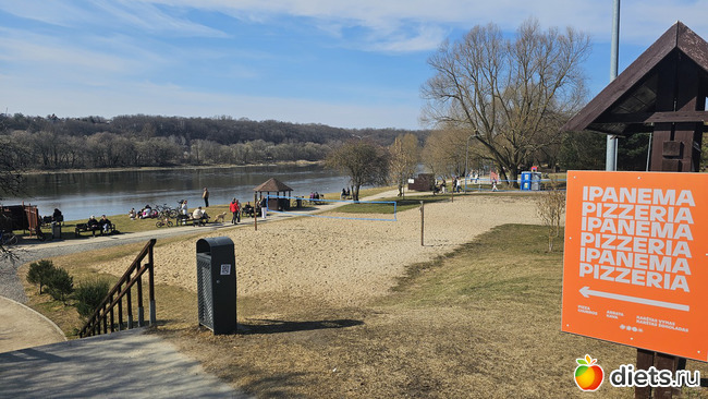Подошли к пляжу. День теплый, народу полно. Летом тут яблоку некуда упасть. Есть детская, волейбольная и баскетбольная площадки.