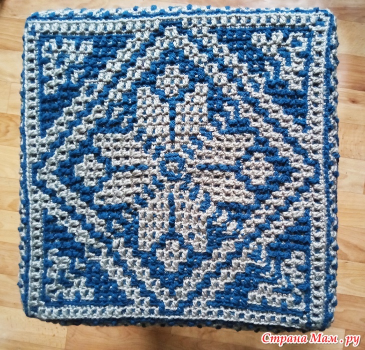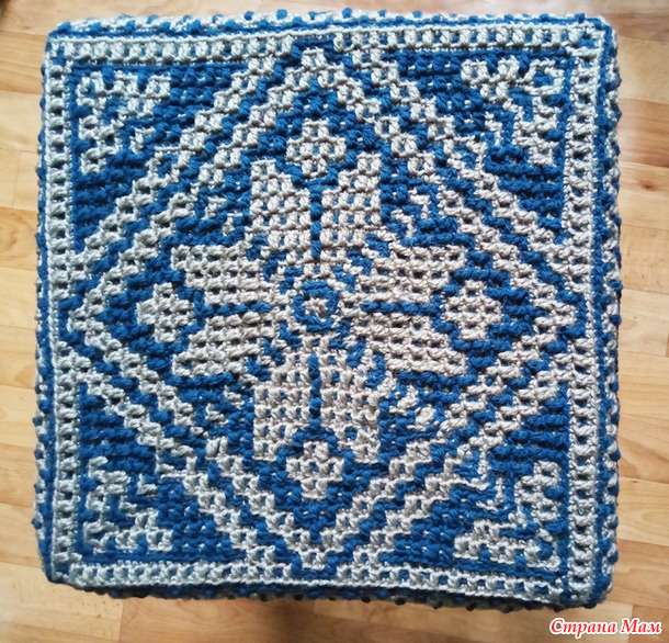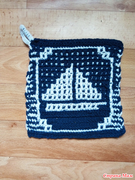 Поэтому сочинила сама схему и связала прихватку мозаикой крючком 2,5 из синей ноунейм и белой детской новинки