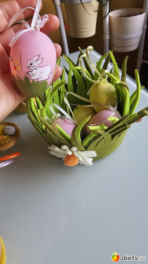 Крашеные яйца подвешиваем на комнатные растения. А корзинка используется для настоящи крашеных яиц