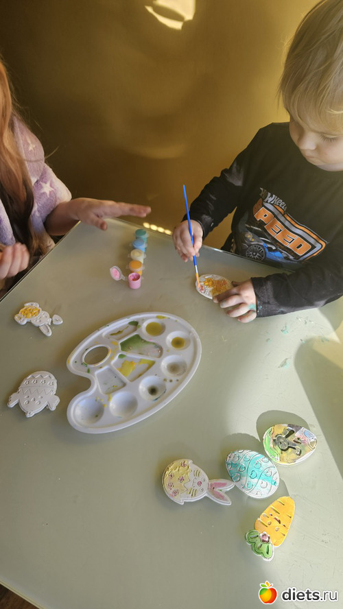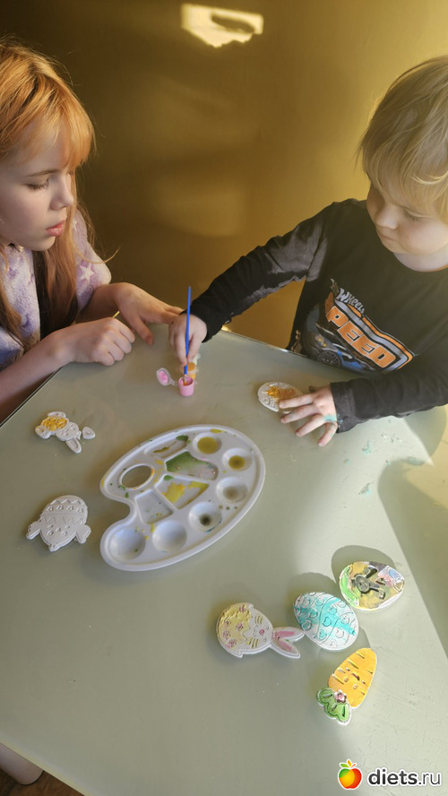 Дети сделали последние поделки на тему праздника. Вчера со старшим братом их вылепили из белой глины, сегодня с сестрой раскрасили