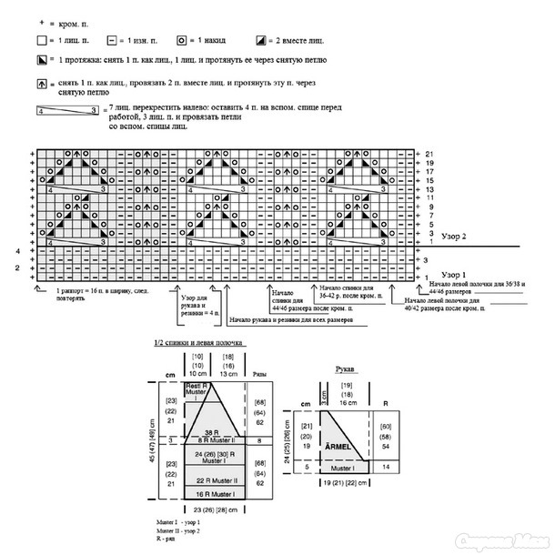 Одновременно от начала пройм выполнить узором 2 еще 38 р. и последний р. полочки провязать узором 1.
