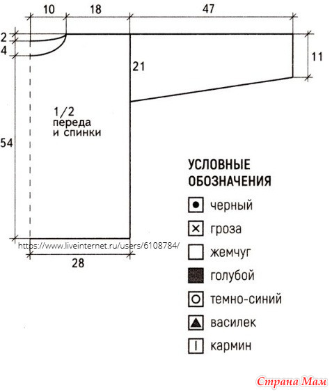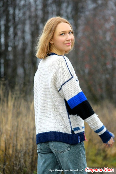 Спинка: темно-синей нитью наберите цепочку из 14 возд. п. и вяжите 108 рядов резинки. Затем по боковой стороне резинки вяжите ст. с/н ( 108 п.) нитью цвета речной жемчуг. Вяжите ровно до необходимой длины.