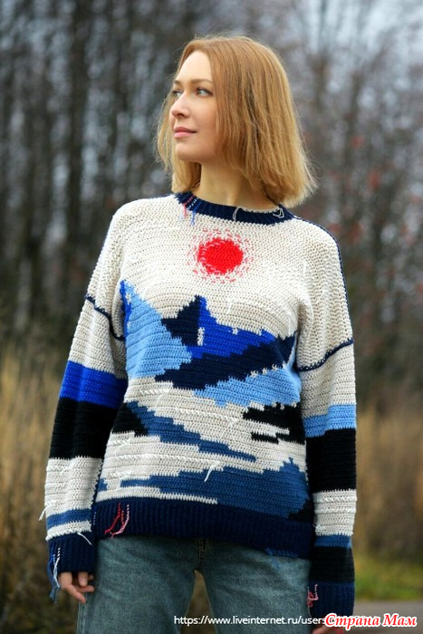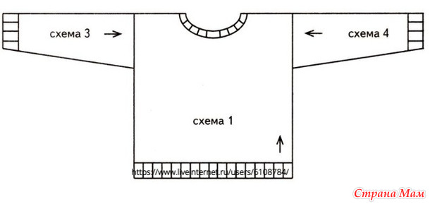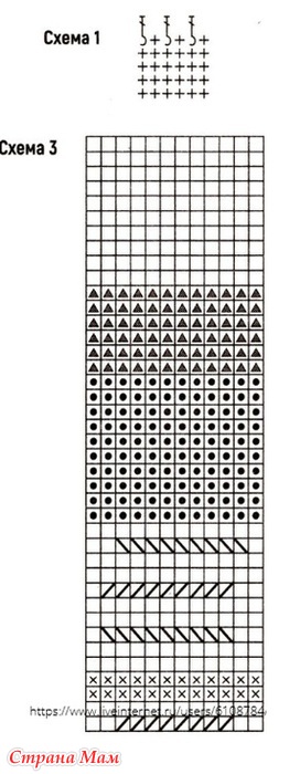 Рукава: темно-синей нитью наберите цепочку из 14 возд. п. и вяжите 48 рядов резинки. Затем по боковой стороне резинки свяжите 1 ряд ст. с/н (= 48 п.). Далее вяжите, чередуя нити разных цветов в соответствии со схемами 3 и 4. При этом в каждом втором ряду прибавляйте по 1 ст. с/н с обеих сторон. На готовых деталях нитью сурового цвета выполните стежки, оставляя на лицевой стороне кончики нитей длиной 3 см.