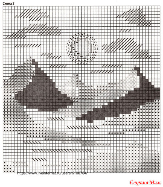 Перед: темно-синей нитью наберите цепочку из 14 возд. п. и вяжите 108 рядов резинки ст. б/н. Затем по боковой стороне резинки свяжите 1 ряд ст. с/н ( 108 п.). Далее вяжите рисунок по схеме 2. Одна клетка в схеме = 2 ст. с/н. После вывязывания схемы выполните закругление для выреза горловины в соответствии с выкройкой. Затем вышейте стежки на солнце розовой и коралловой нитями. Суровой нитью выполните косые стежки, оставляя на лицевой стороне кончики нитей длиной 3 см.
