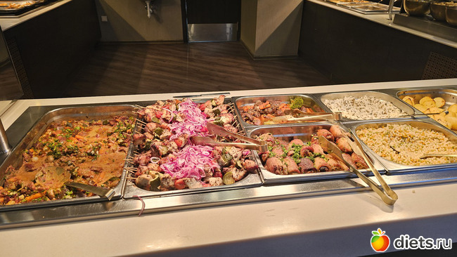 Суп только один, множество салатов, как майонезных, так свежих, множество вторых, а тортов просто нереальное количество. Напитки: сок, чай, кофе, а за отдельную плату можно было заказать и алкоголь. Удивило большое количество безглютеновых блюд, везде подписано. Кое-что пофоткала, но народу много, не везде подойти.