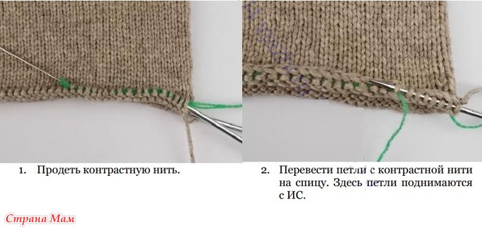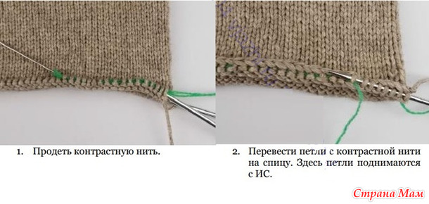 После того, как будет продета контрастная нить, необходимо свободно закрыть все петли как изнаночные и обрезать нить. Затем поднять петли от контрастной нити круговыми спицами № 3. Ряд закрытых петель (предыдущий ряд) находится на другой стороне работы, т.е. петли будут подниматься с изнаночной стороны работы (ИС) (рис. 2, стр. 7).