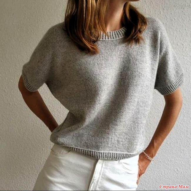 Топ вяжется сверху вниз. Сначала вяжется спинка, с формированием плеч укороченными рядами. Затем вяжутся правая и левая части переда из петель спинки. Спинка и перед вяжутся прямыми/обратными рядами (лицевыми и изнаночными рядами) до конца пройм. Затем обе части соединяются и вяжутся одной деталью круговыми рядами. Окат рукава формируется двойными центральными убавлениями. Планки туловища и рукавов поднимаются по краю и вяжутся скрещенной резинкой круговыми рядами. В завершение поднимаются петли по краю горловины и вяжется планка скрещенной резинкой круговыми рядами.