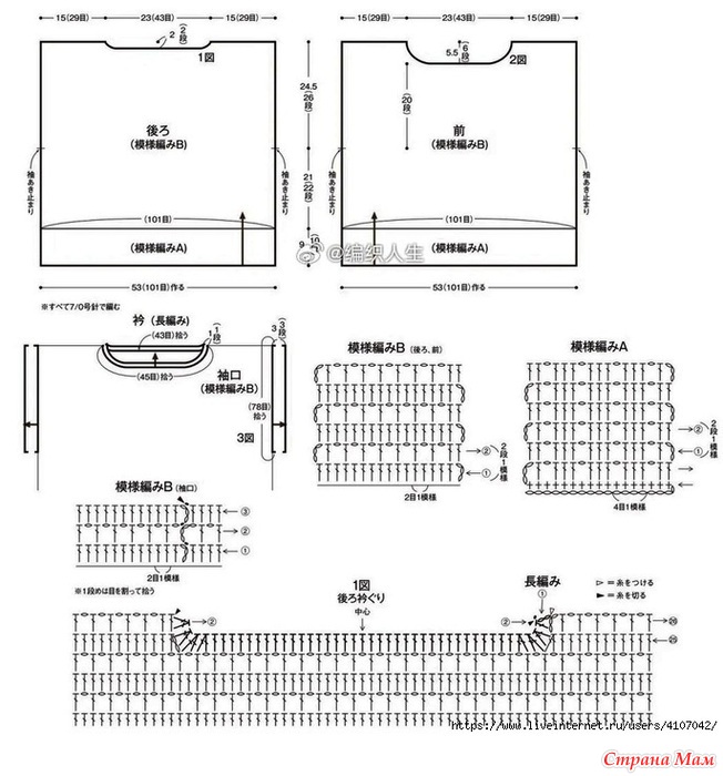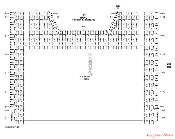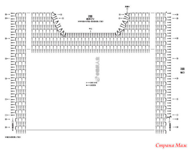 Краткое описание... Для воротника и манжет набирайте петли, ориентируясь на схему. Для воротника используйте столбики с накидом, а для манжет — узор B, вяжите по кругу туда и обратно.