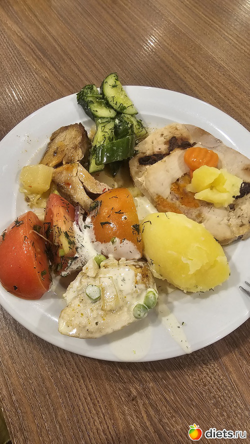 Свиной рулет, тушеная индейка с ананасами, курфиле в сырном соусе, картошка, салат