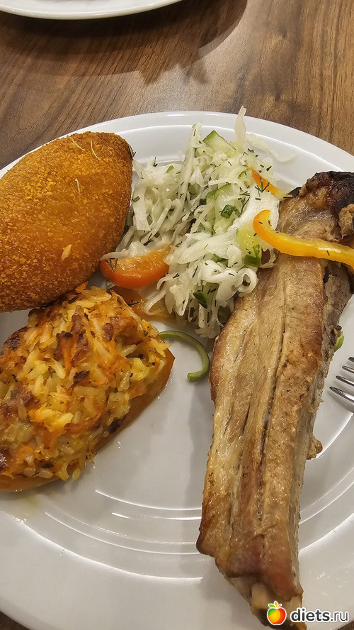 Котлета по-киевски, ребра, фаршированный перец, салат