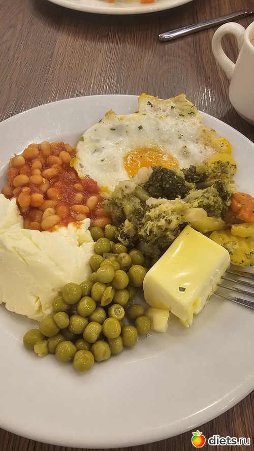 Жареное яйцо, 2 вида омлета, фасоль, горох, тушеные овощи