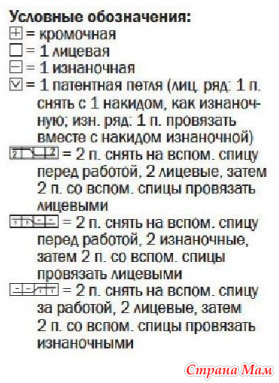 Плотность вязания: узор «Косы» 29 п. х 35 р. = 10 х 10 см; полупатентный узор 21,5 п. х 48 р. = 10 х 10 см.