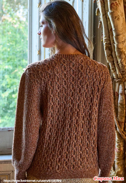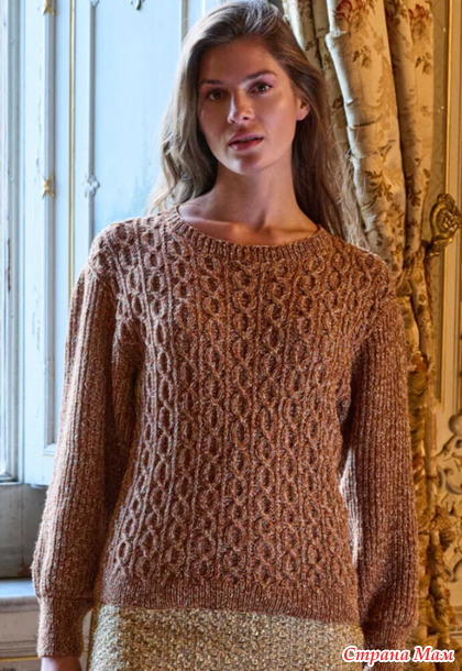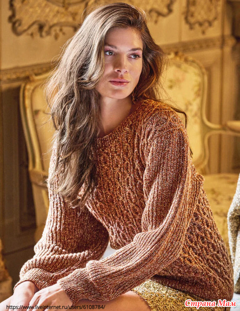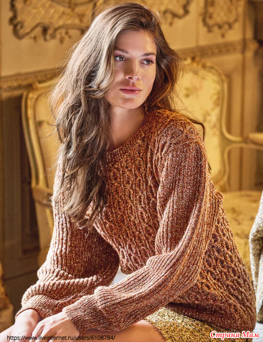 Вам потребуется: пряжа 1 (80% овечьей шерсти, 20% шелка; 266 м/50 г) - 300 (350) 400 г терракотового цвета и пряжа 2 (51% вискозы, 49% полиэстера; 300 м/25 г) - 150 (175) 200 г золотистого цвета; спицы № 3 и 3,5; круговые спицы № 3.