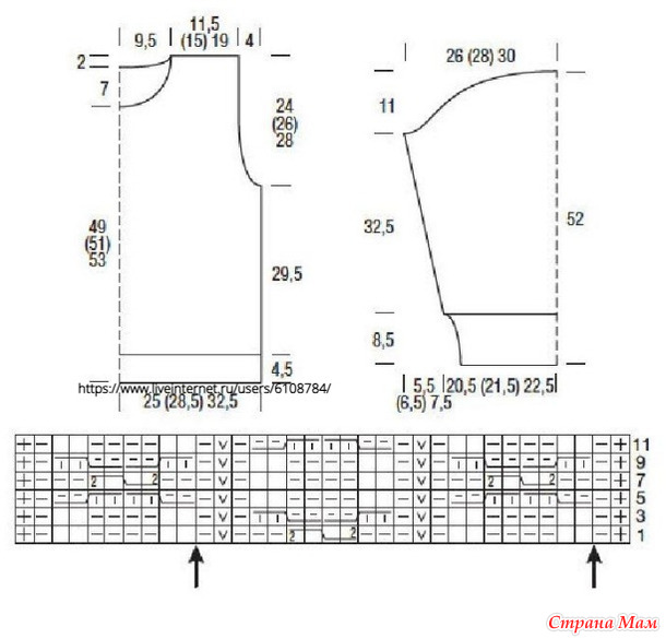 Плотность вязания: узор «Косы» 29 п. х 35 р. = 10 х 10 см; полупатентный узор 21,5 п. х 48 р. = 10 х 10 см.