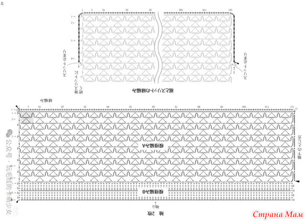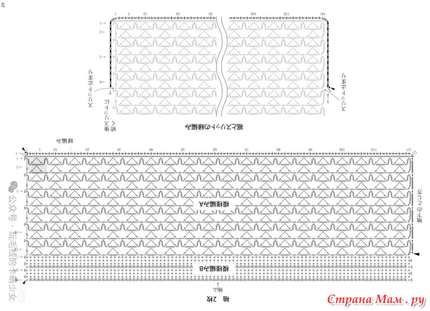 Первые 28 рядов вяжите по схеме А, следующие 10 рядов — по схеме В, а оставшиеся 18 рядов — по схеме А.