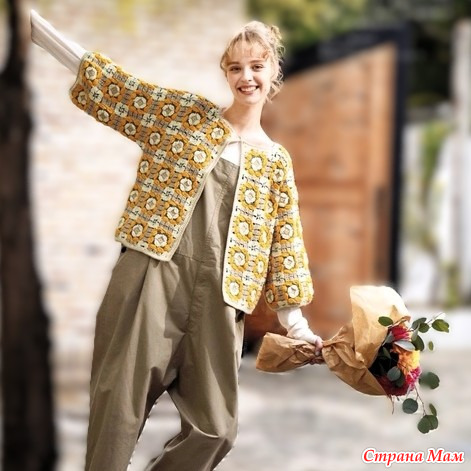 Кардиган из плотных квадратных мотивов. Крючок.