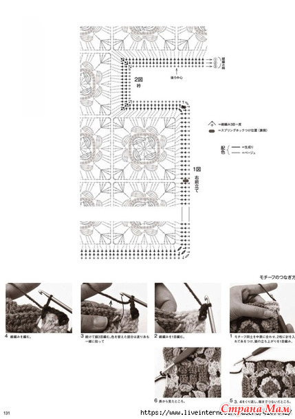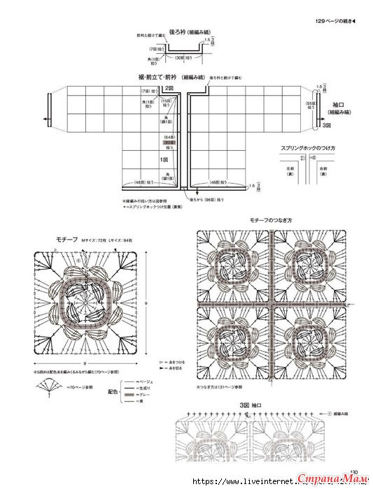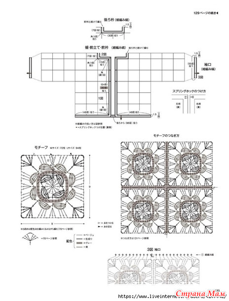Основная часть и рукава вяжутся методом соединения мотивов. Необходимо провязать указанное количество мотивов, затем соединить их столбиками без накида, лицевыми сторонами друг к другу.