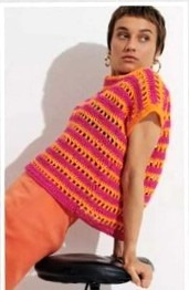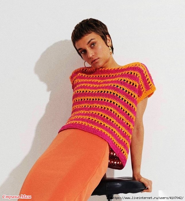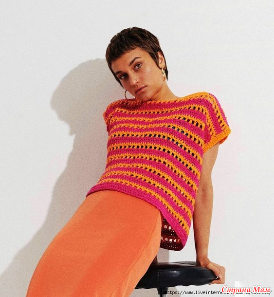Яркий топ в полоску с квадратным вырезом горловины. Крючок