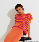 Завершение обработки пройм: крючком 6 мм и оранжевой пряжей провяжите по кругу вокруг проймы: 3 ряда столбиками без накида, а) 44 петли. б) 46 петель. д) 48 петель. г) 50 петель. Обрежьте и заправьте пряжу.