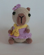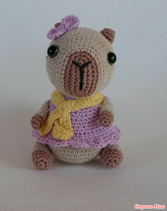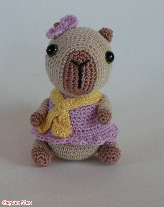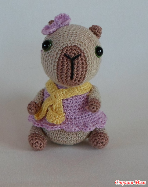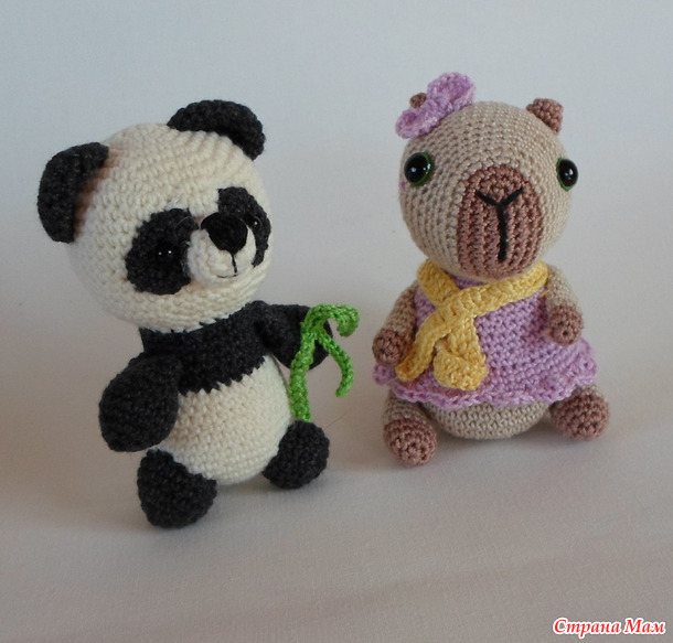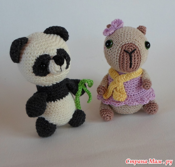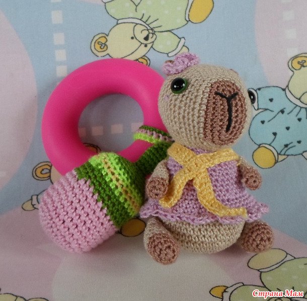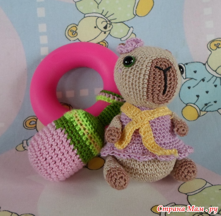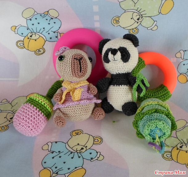 Наконец-то могу отчитаться по капибаре ( и не только! )Моя капибара решила порадовать правнука,а ей компанию составила пандочка! Обе зверушки- погремушки! Внутри каждой игрушки контейнер от киндер-сюрприза в котором лежат деревянные шарики-гремелки.Колечки купила в спортивном магазине, очень они мне понравились-яркие,упругие, легкие! Глазки капибары приклеены моментом, а у пандочки пришиты нитками. Связаны из alize miss кр № 1. величина игрушек16 и 14 см