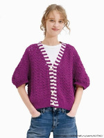 Краткое описание... Выемки по бокам и на плечах соединяются соединительным столбиком. Для манжет наберите указанное количество петель из начальной цепочки и клина и вяжите по кругу резинкой 1х1 с перекрученными петлями. Завершите вязание так же, как и нижний край. Для планки и воротника начните вязание с начальной цепочки из резинки 1х1 и вяжите резинкой 1х1 с перекрученными петлями. Сделайте петлю для пуговицы на правой планке. Завершите вязание так же, как и нижний край, и соедините с основной частью изделия соединительным столбиком. Пришейте пуговицы для завершения.
