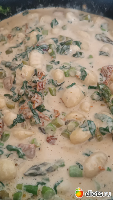 Теперь добавляем ньоки, заливаем сливками, солим, перчим и тушим под крышкой 7-10 минут, пока ньоки не станут мягкими. В самом конце посыпаем пармезаном. накрываем крышкой буквально на минутку.