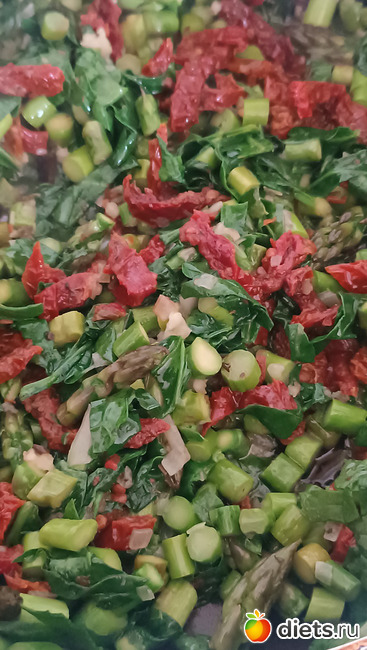 Добавить порезаную спаржу, обжарить 5-7 минут