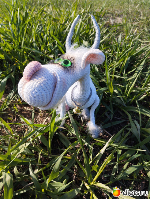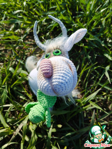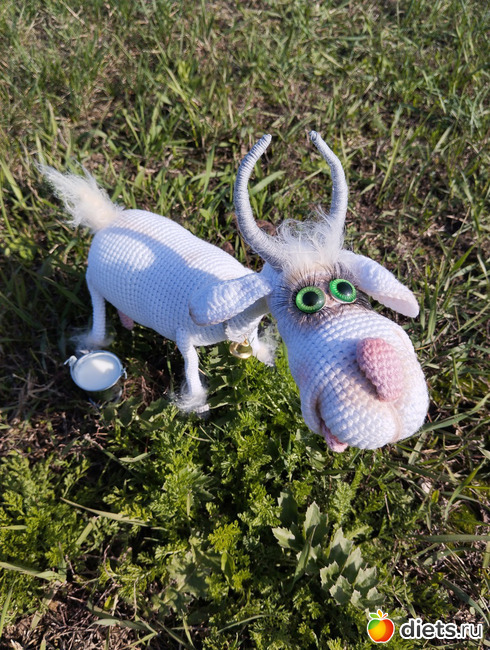 Связана козочка по Мк Светланы Перцевой "Коза-дереза". Пряжа Газзал Бебикоттон и Техно (пушистая), кажется, от Ярнарт, крючок 2. Рост без рогов примерно 18см, в длину около 25см. На каркасе, самостоятельно стоит в разных позах, но голова немного перевешивает))) На фотографиях ведерко настоящее миниатюрное, молоко тоже настоящее, хотя и коровье (из магазина)
