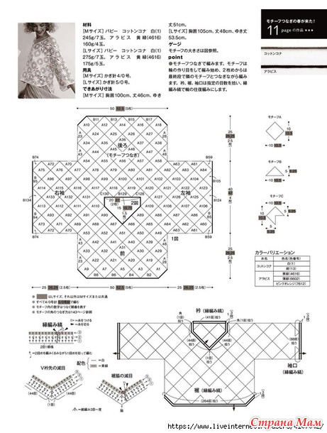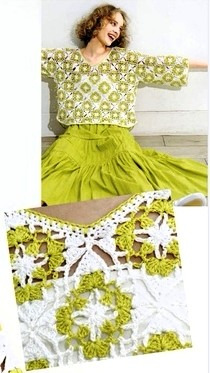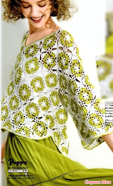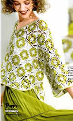 В этом проекте используется техника соединения мотивов. Для создания мотивов начните с создания волшебного кольца, а начиная со второго мотива, соединяйте соседние мотивы в последнем ряду. Для воротника, подола и манжет наберите указанное количество петель и вяжите туда-обратно зеленым узором.