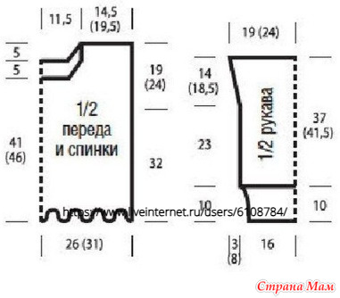 Перед: вязать, как спинку, но для более глубокой горловины уже через 41 см = 106 р. (46 см = 120 р.) от начального ряда закрыть средние 25 п. и обе стороны закончить раздельно. Для скругления горловины по внутреннему краю закрыть в каждом 2-м р. 5 х 2 п.