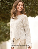 Сборка: выполнить плечевые швы. Для бейки горловины на круговые спицы № 3 набрать по краю горловины 100 п. и связать 5,5 см = 17 круг. р. узором 1. Закрыть петли по рисунку. Вшить рукава. Выполнить швы рукавов и боковые швы.