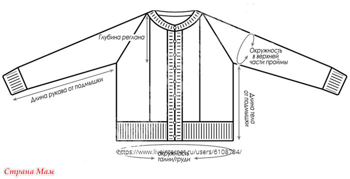 След. ряд (изн.): поместить маркеры след. образом: 1 изн. петля переда, pmx; 6 (6, 8, 8, 8, 8, 8, 10, 10, 10, 12, 12) изн. петель рукава, pmx; 36 (38, 42, 46, 48, 50, 52, 56, 58, 64, 66, 70) изн. петель спинки, pmx; 6 (6, 8, 8, 8, 8, 8, 10, 10, 10, 12, 12) изн. петель рукава, pmx; 1 изн. петля переда.