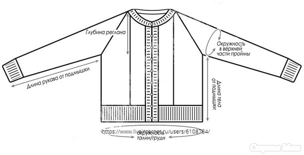 • Затем набирают петли для каждой полочки, и размещают 2 панели ажурного узора, перед формированием рукавов и верхней части тела с прибавками регланов. Окаты рукавов отделяют и откладывают в сторону, затем тело вяжут до желаемой длины. Поднимают петли рукавов и вяжут сверху вниз, по переду провязывают планки резинкой и далее провязывают окантовку горловины. Петлицы I-cord завершают кардиган.